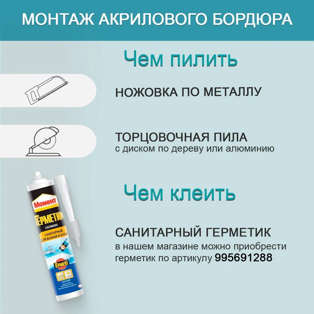 Для распила потребуется ножовка по металлу или торцовочная пила с диском по дереву или алюминию, монтаж производится на герметик или водостойкий клей.